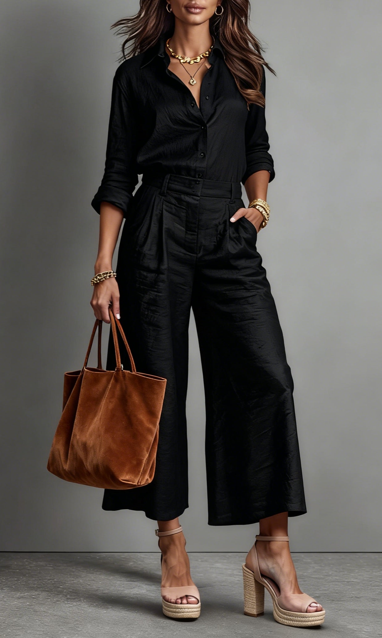 Fashion All Black Skinny Turtleneck T-shirt Pleated Skirt Set