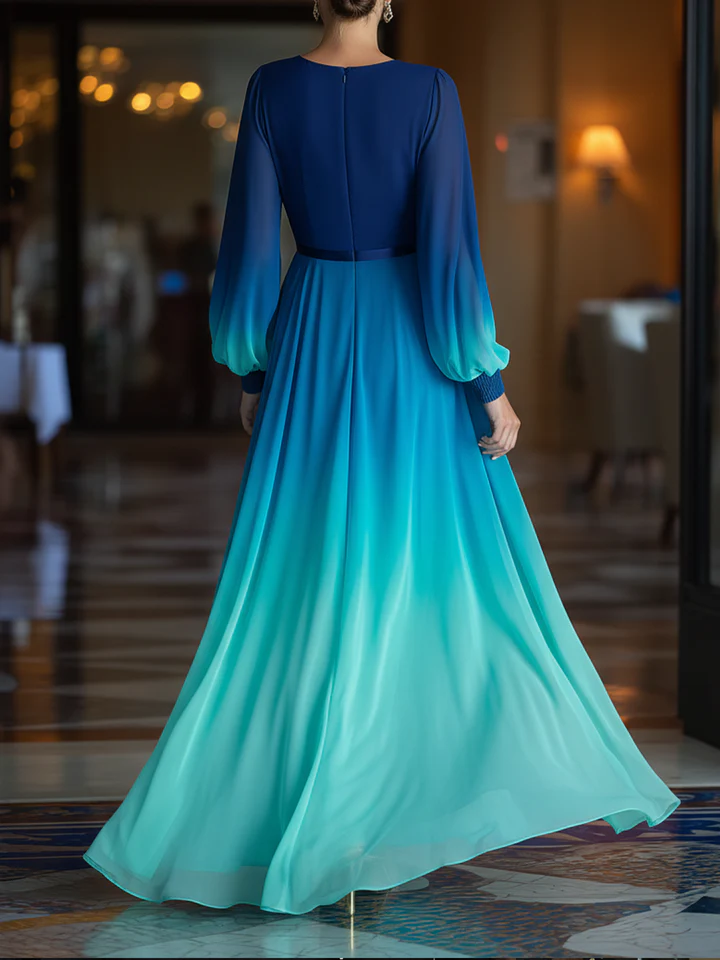 Blue-green Gradient Printed Chiffon Maxi Dress