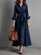 Crafted from lightweight cotton twill, this shirt dress reimagines classic tailoring with clean lines, a sharp collar, and a flowing skirt. A bow at the waist accents the silhouette, perfect for effortless chic, from business meetings to sophisticated evenings.