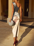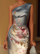 One-shoulder Satin Floral Print Midi Dress