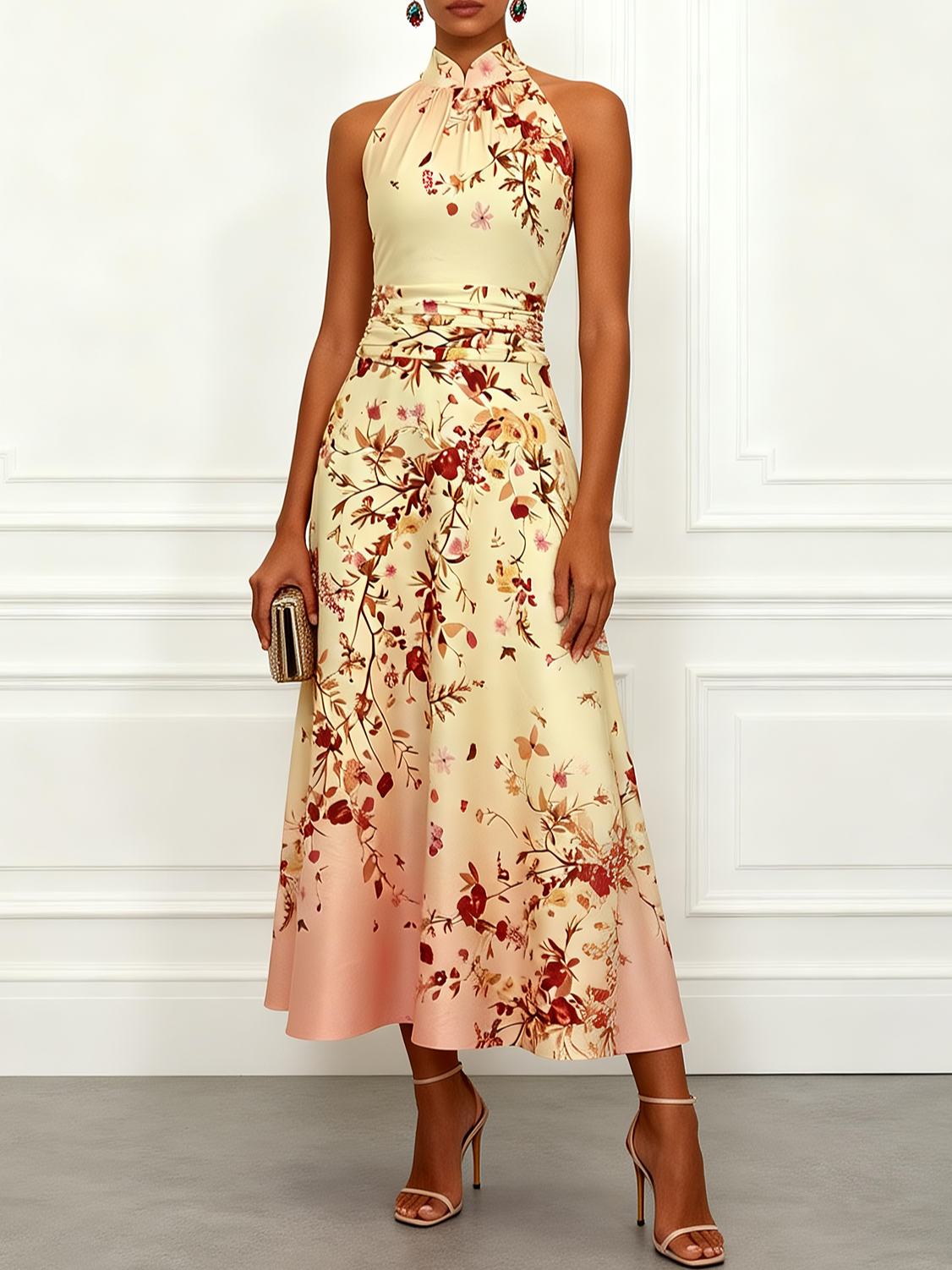 Light Yellow Floral Print Turtleneck Pleated Sleeveless Maxi Dress
