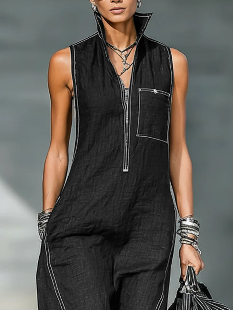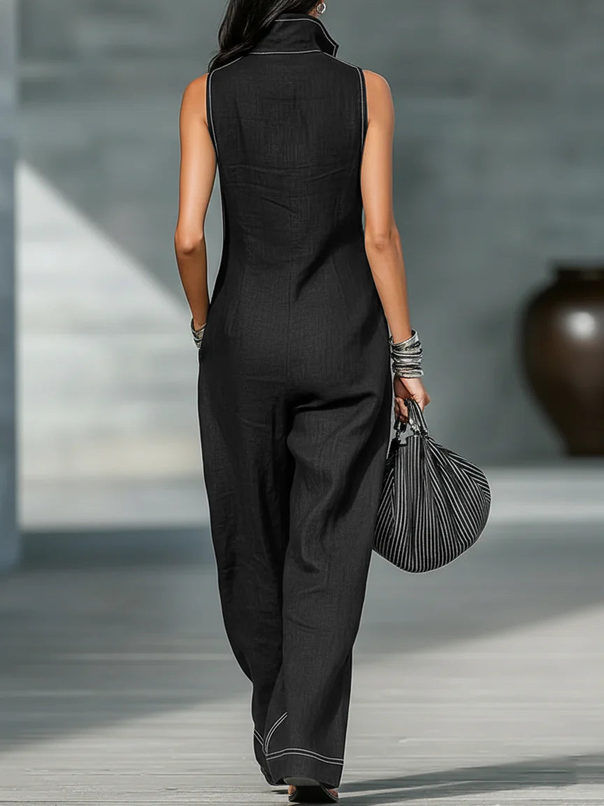 Minimalist Loose-fitting White Trim Sleeveless Jumpsuit