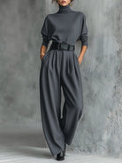 All-black Turtleneck Long-sleeved T-shirt And Straight-leg Pants Two-piece Set (including Belt)