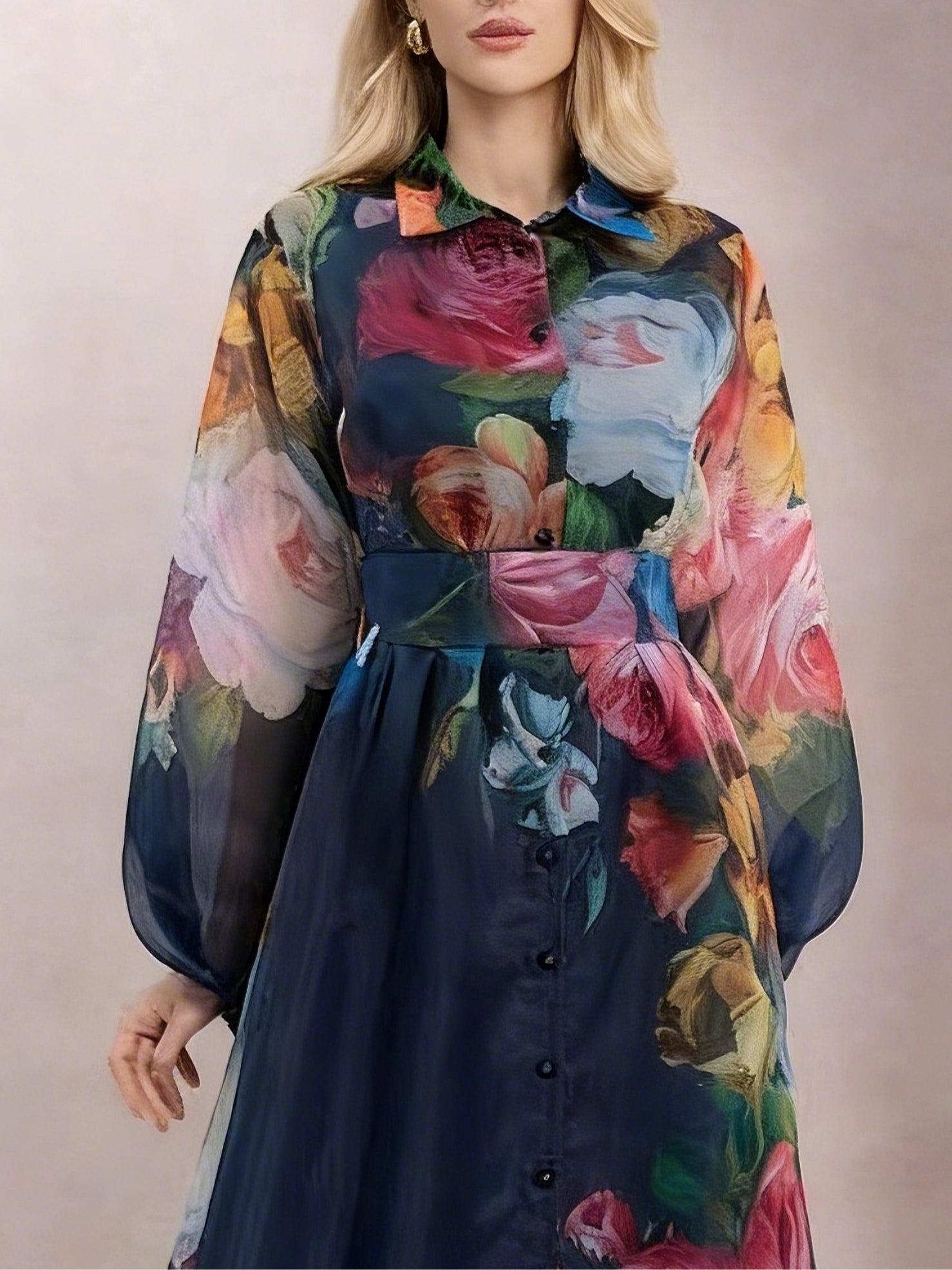 This long dress is as light and airy as a watercolor dream, allowing you to enjoy its graceful beauty throughout the day. Vibrant floral patterns adorn the lightweight organza fabric, creating a flowing and dynamic look, adding a touch of three-dimensional romance to the most crucial areas. Puff sleeves and elastic cuffs provide a comfortable fit, while a matching belt accentuates the waistline, creating a flattering silhouette.