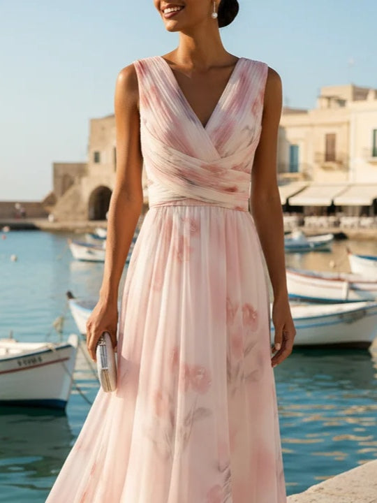 Pink Floral Ruched Chiffon V Neck Sleeveless Maxi Dress
