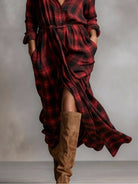 Red Plaid Lapel Button-Down Shirt Maxi Dress