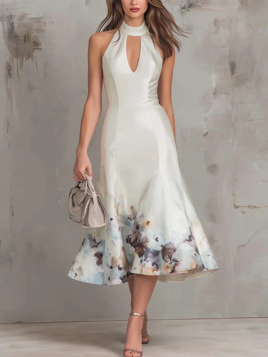 Vintage oil painting style keyhole collar satin midi dress