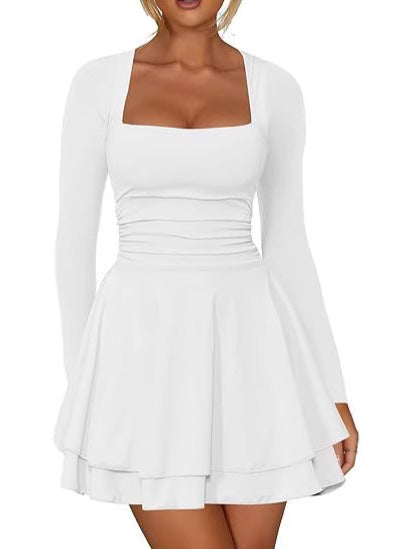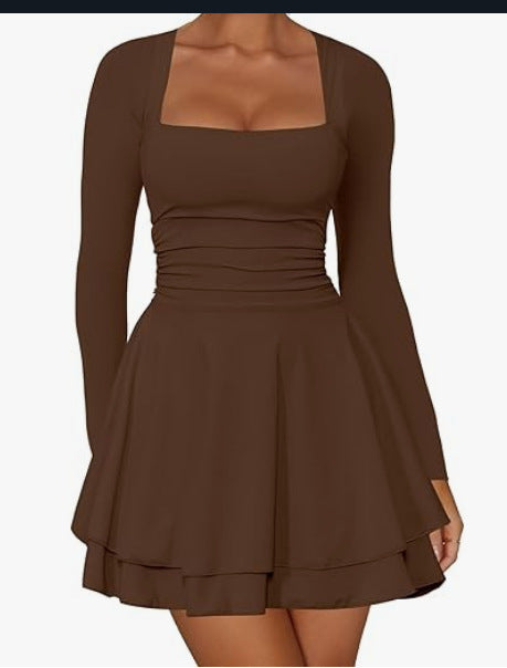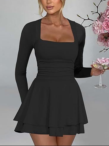 Women's Square Neck Long Sleeve Fitted Waist Mini Dress