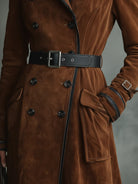 A sophisticated long coat crafted from soft suede, featuring classic black trim accents and a double-breasted front. This elegant coat is designed with a refined lapel collar and a tailored silhouette, perfect for adding timeless style to your cold-weather wardrobe.
