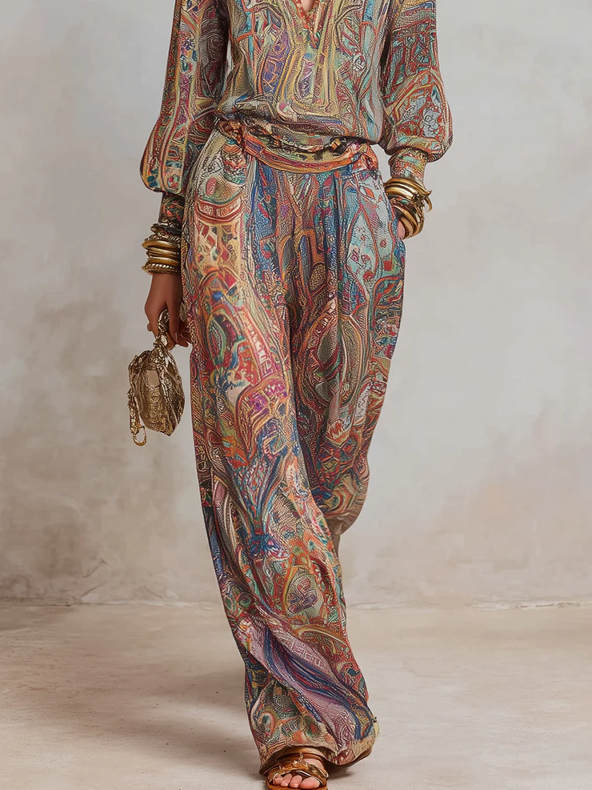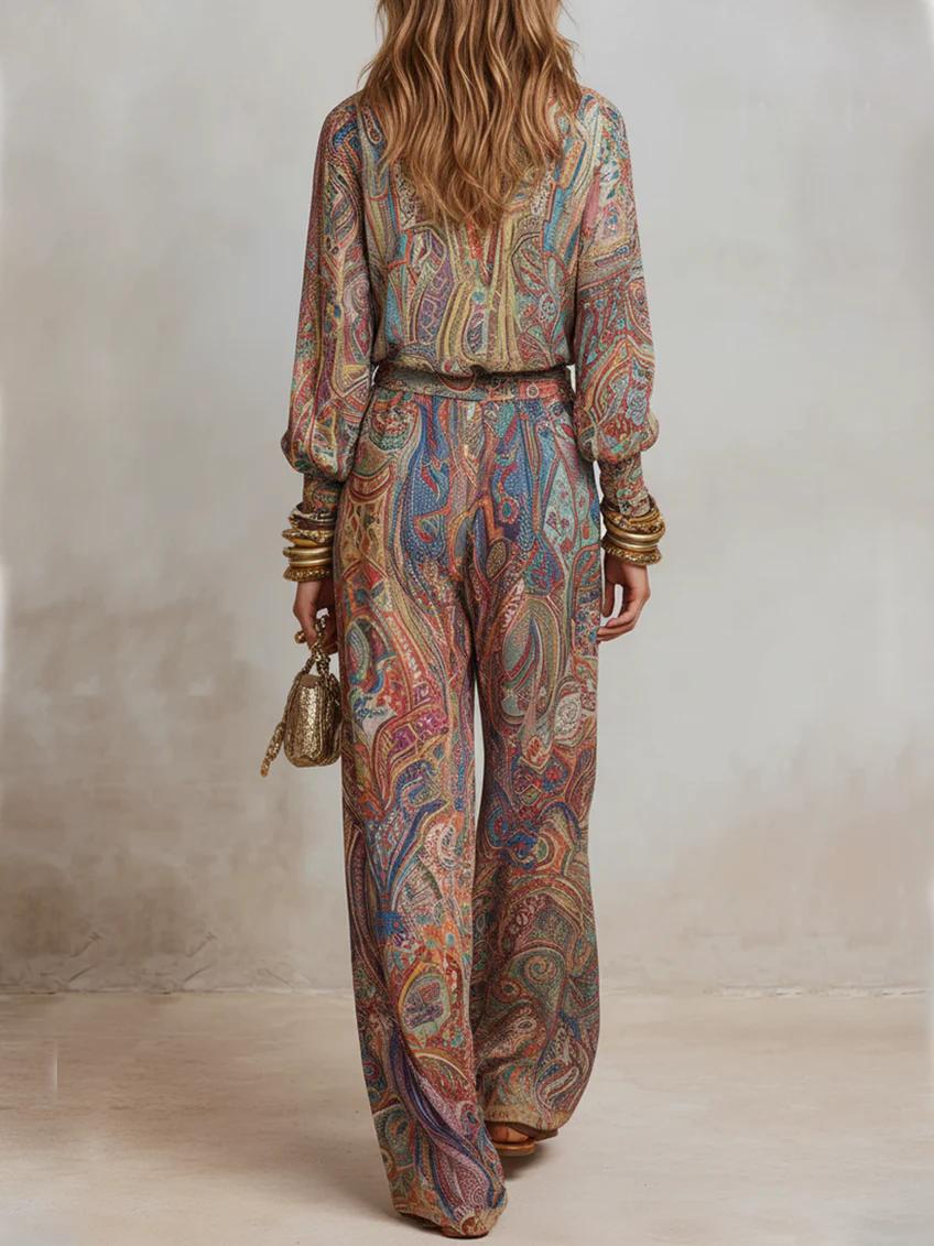 Bohemian Brown Paisley Print Shirt And Wide-leg Trouser Suit