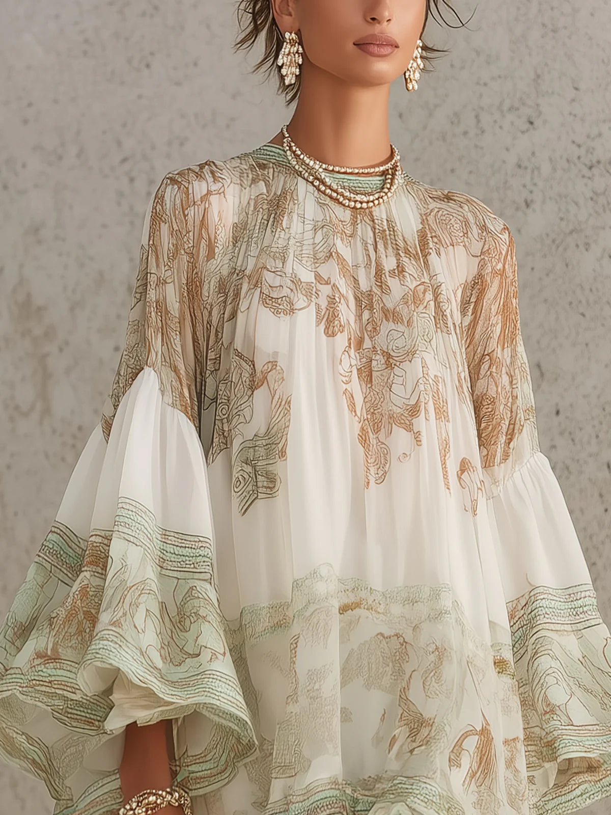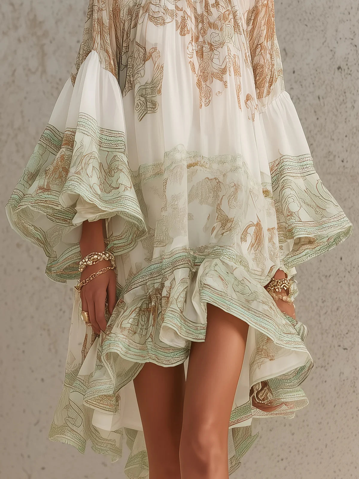 Green Print Ruffle Hem Flounce Sleeve Chiffon Mini Dress