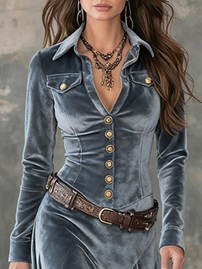 Gray Velvet Lapel Metal Button-down Maxi Dress( (with belt)