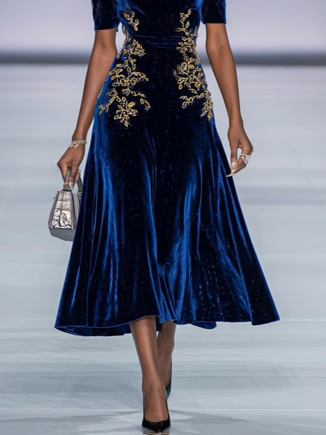 Deep Blue velvet embroidered off-shoulder short-sleeved midi dress