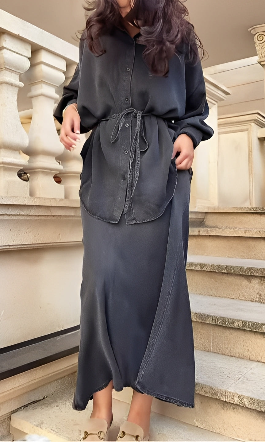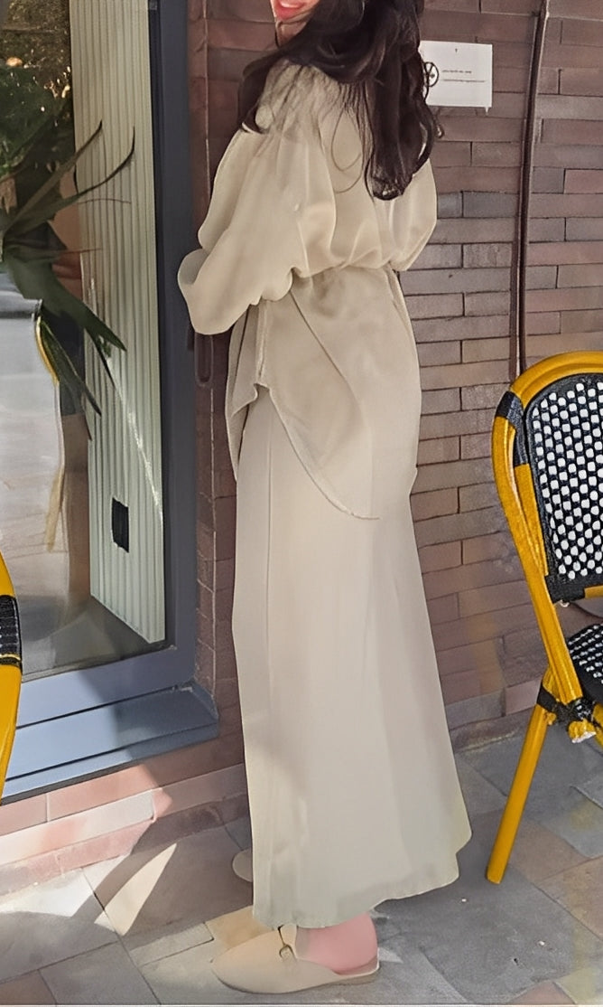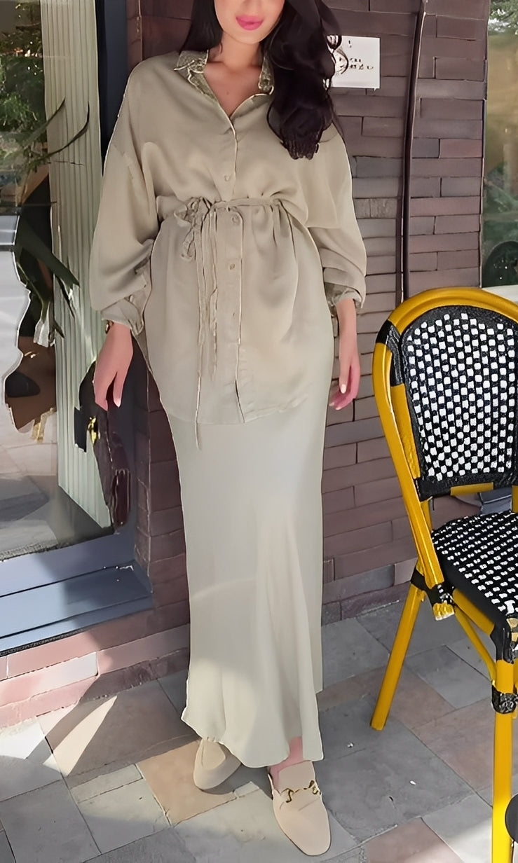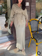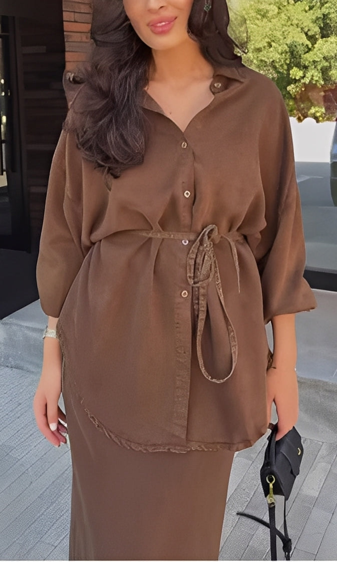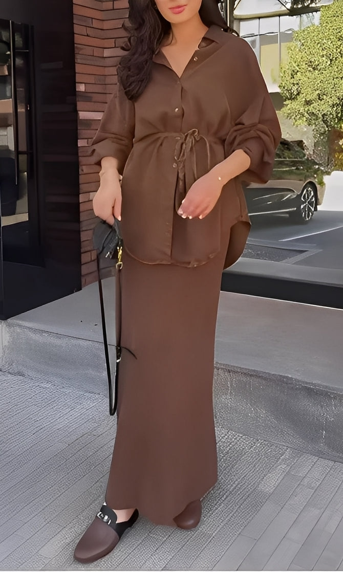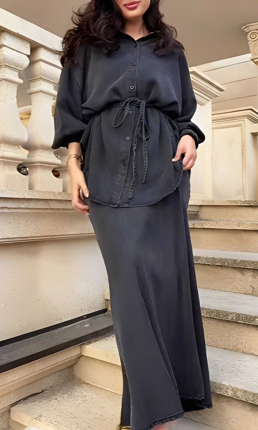 Long-sleeved Tie-Drawstring Shirt and Skirt Set