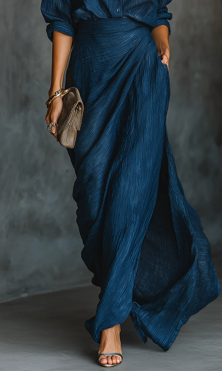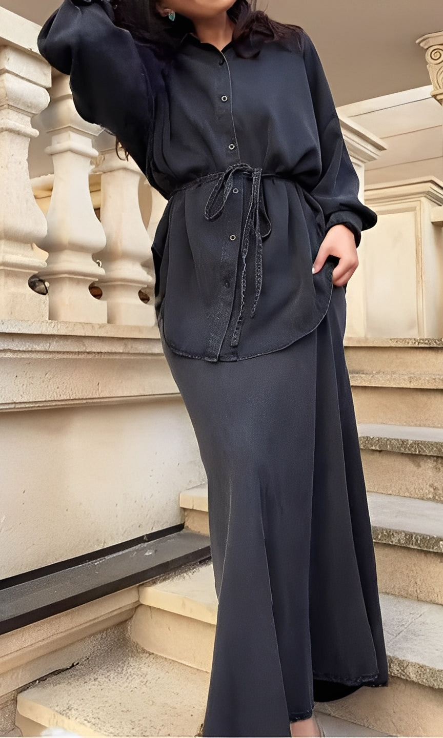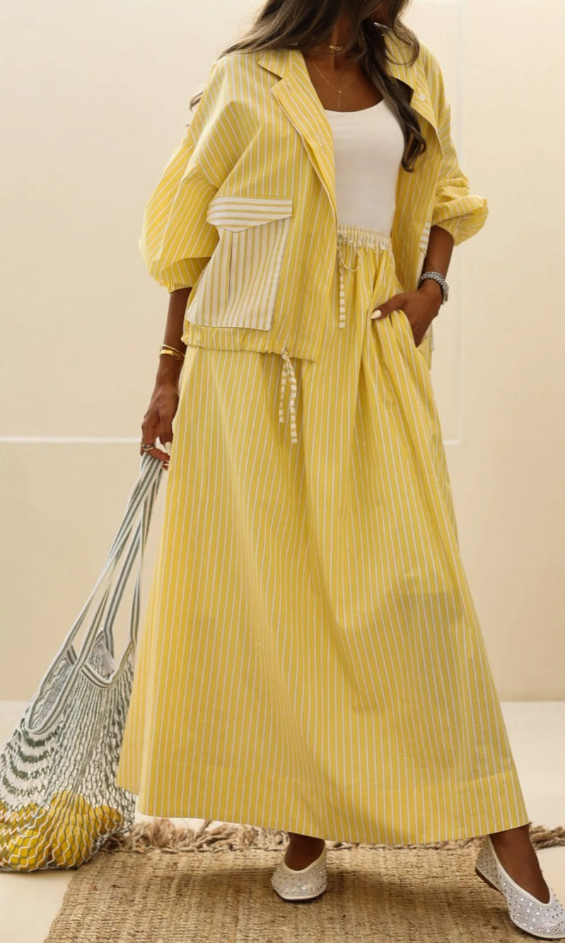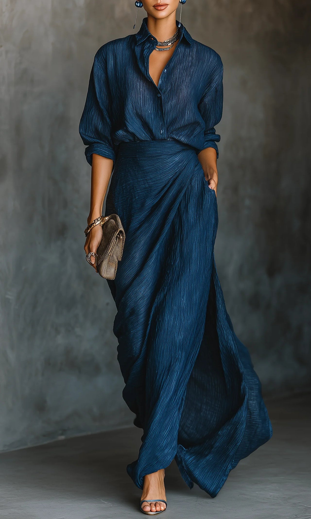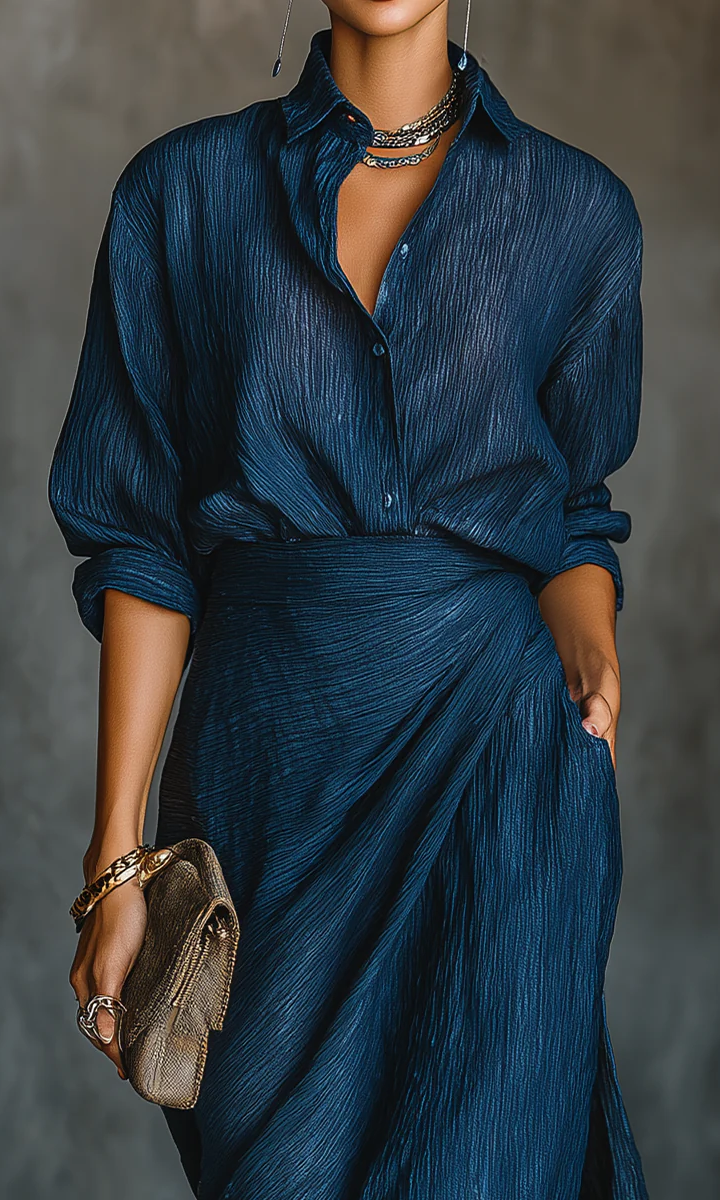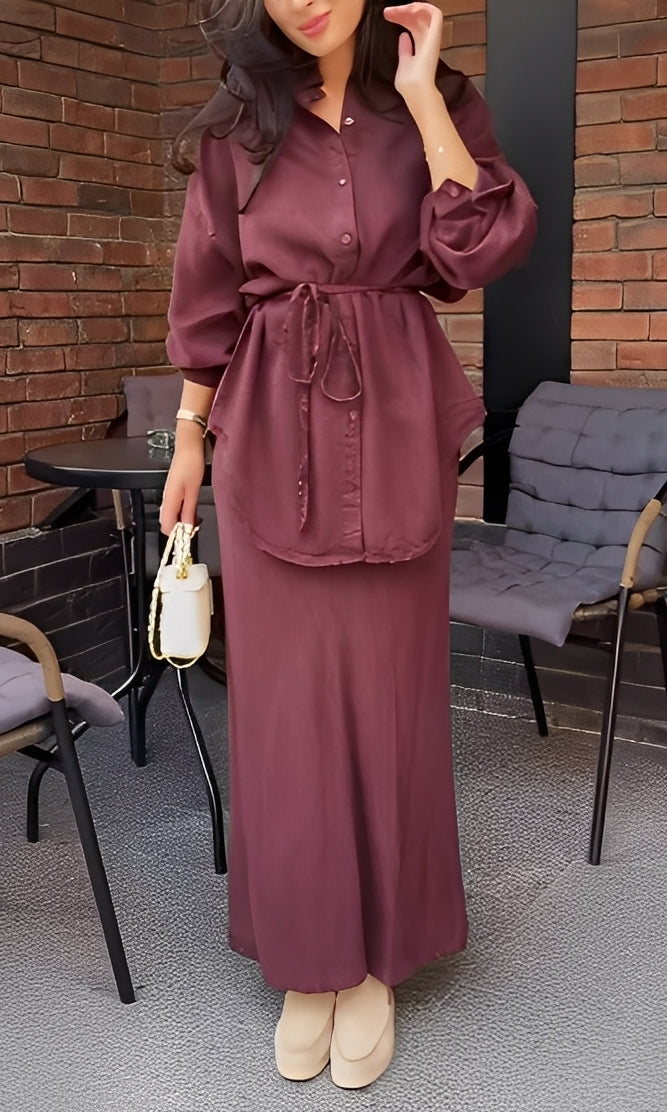 Long-sleeved Tie-Drawstring Shirt and Skirt Set