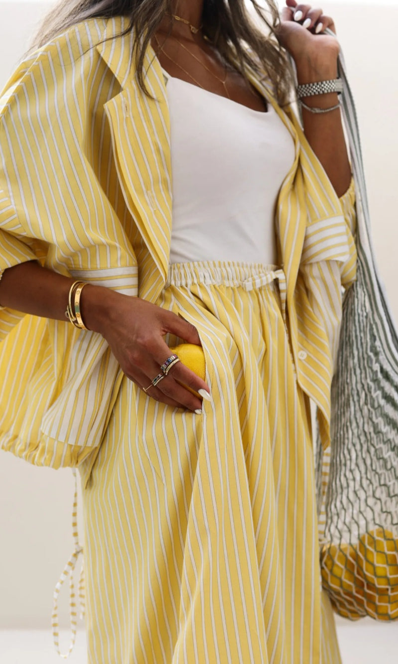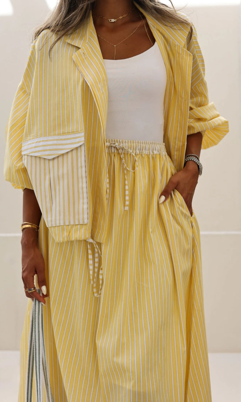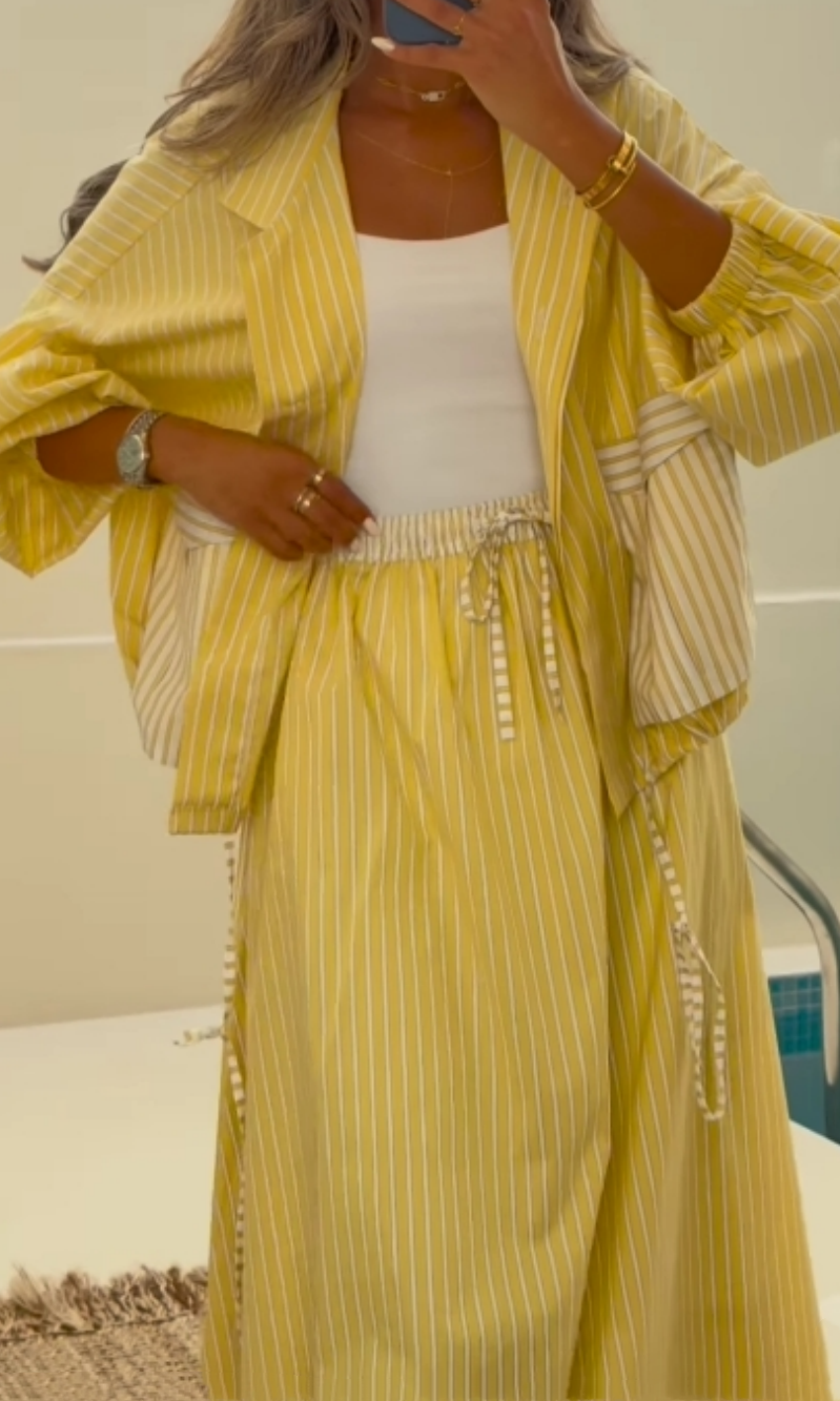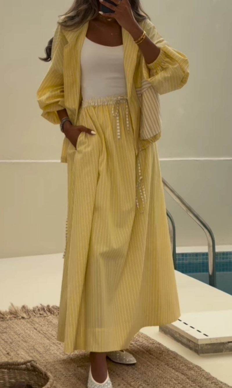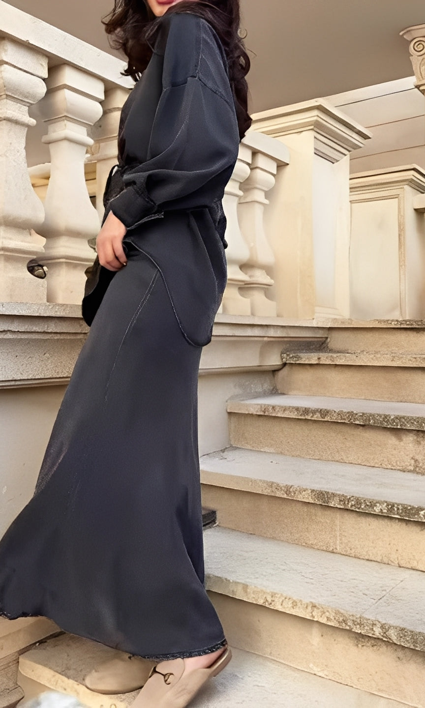 Long-sleeved Tie-Drawstring Shirt and Skirt Set