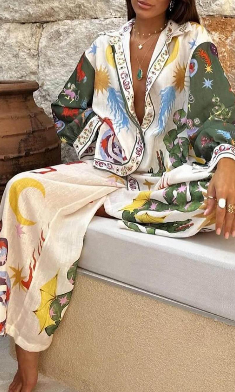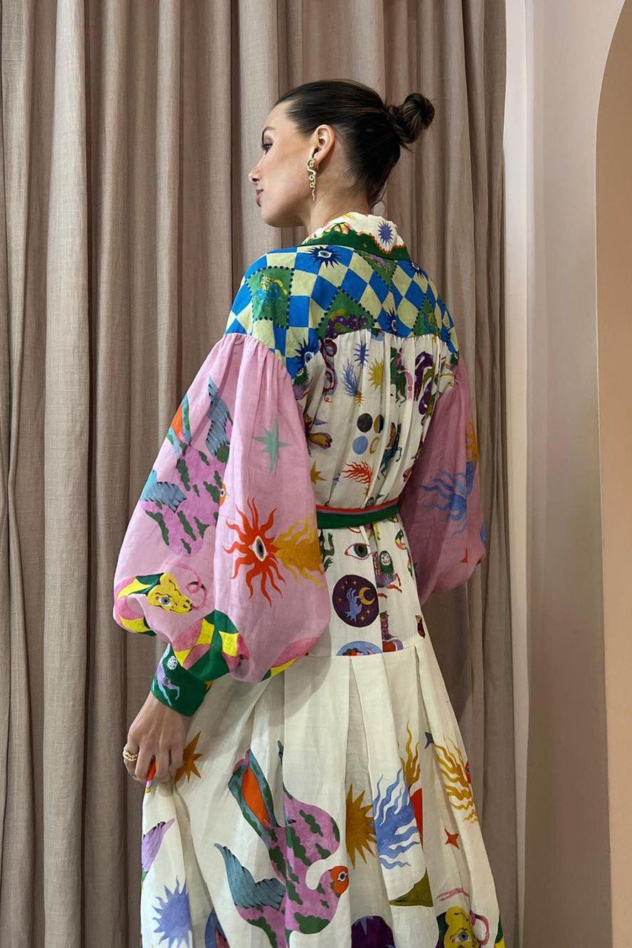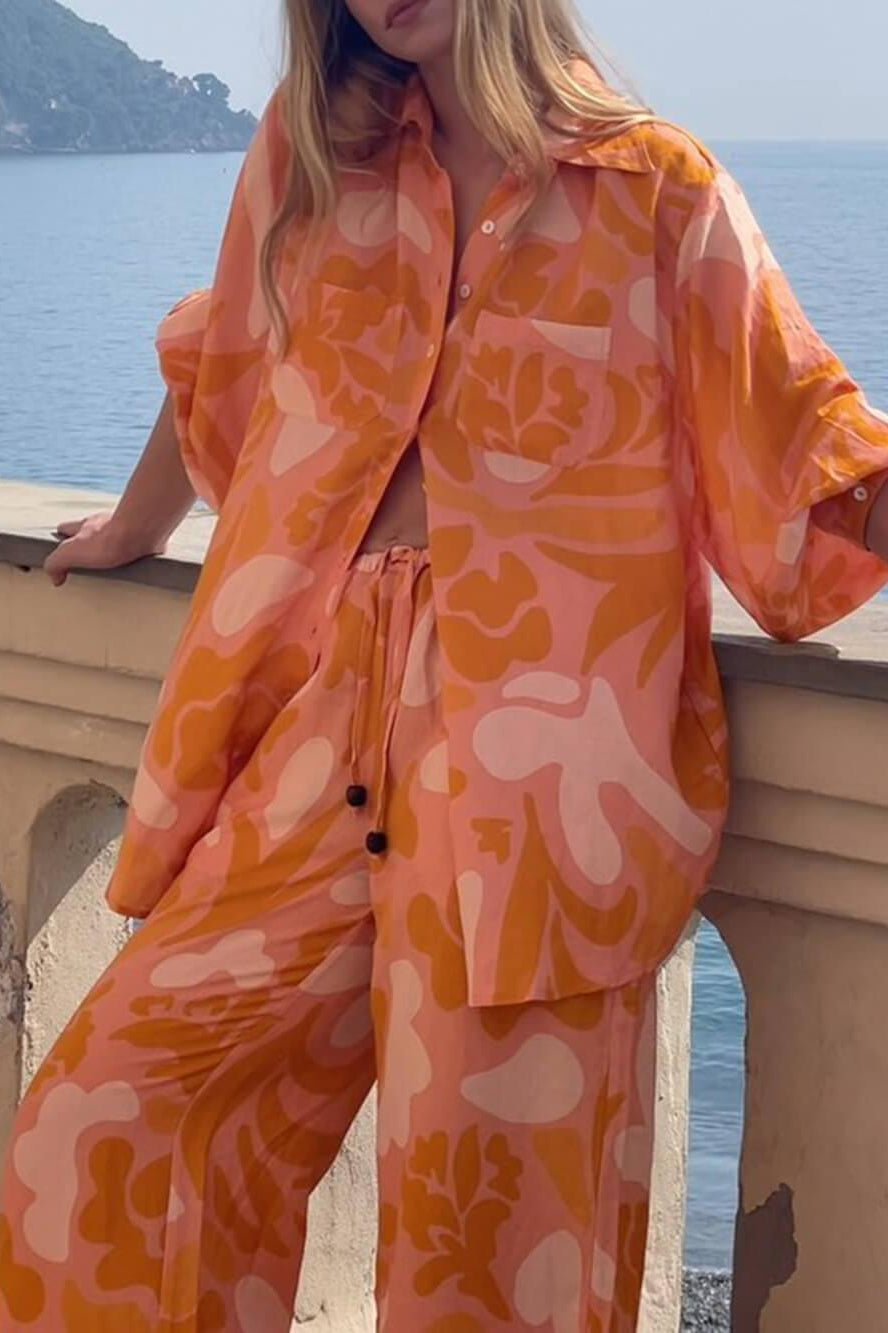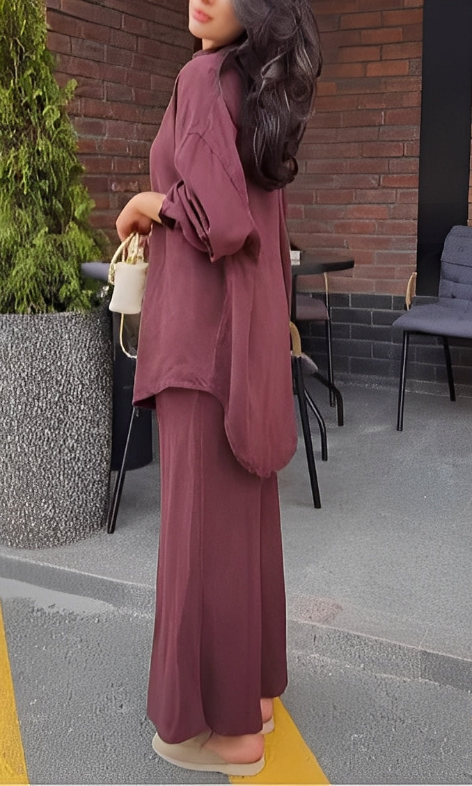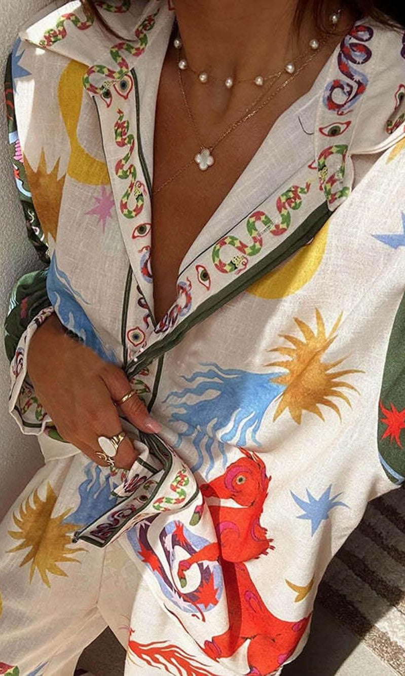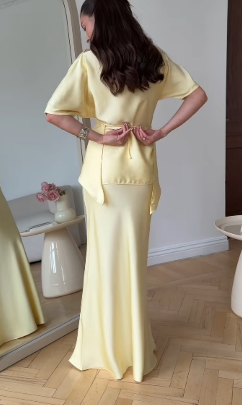 Long-sleeved Tie-Drawstring Shirt and Skirt Set