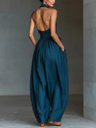 Navy Cross Halter Wide-Leg Jumpsuit With Side Pockets
