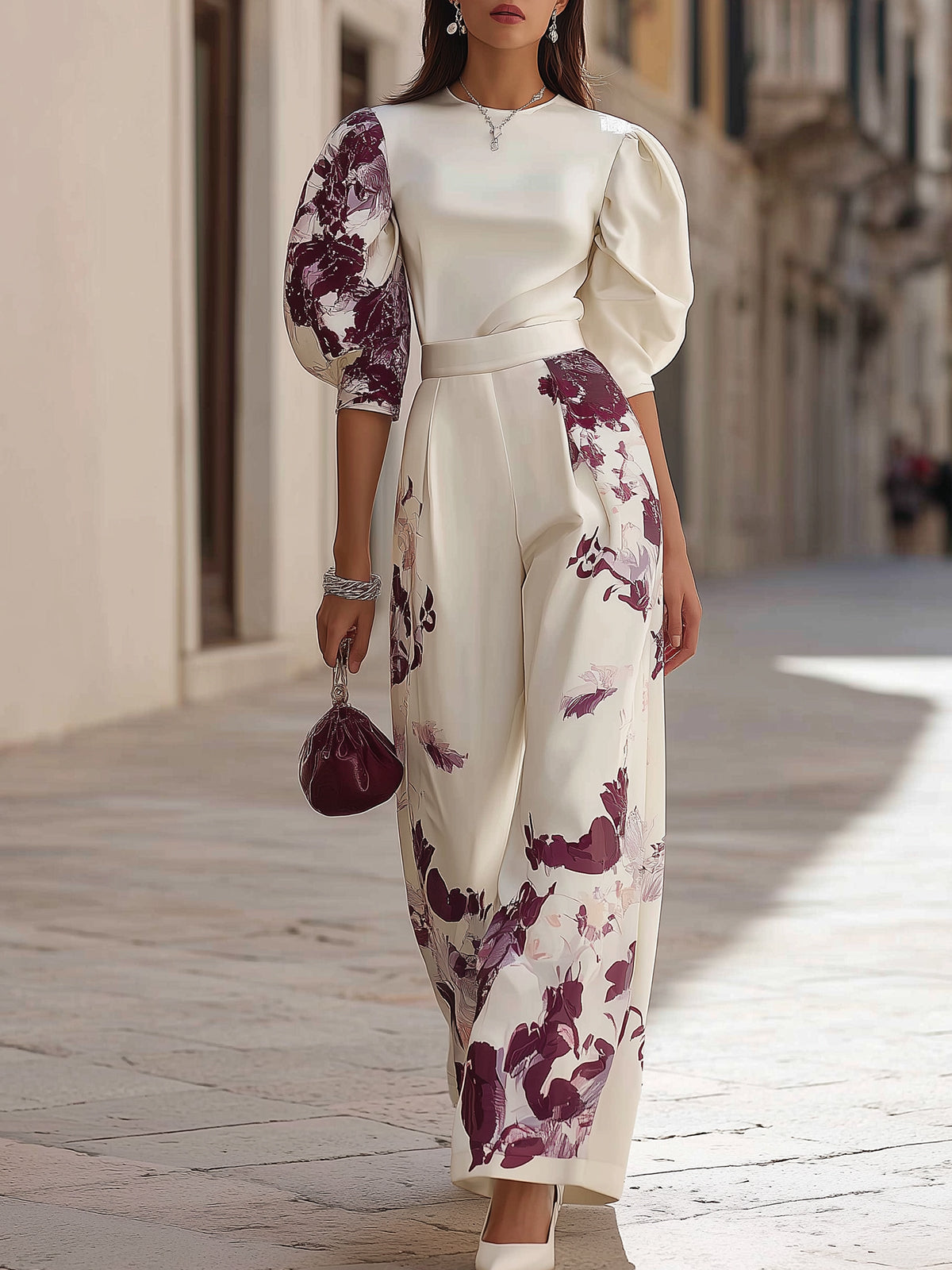 White Puff-Sleeve Pants Set with Partial Print
