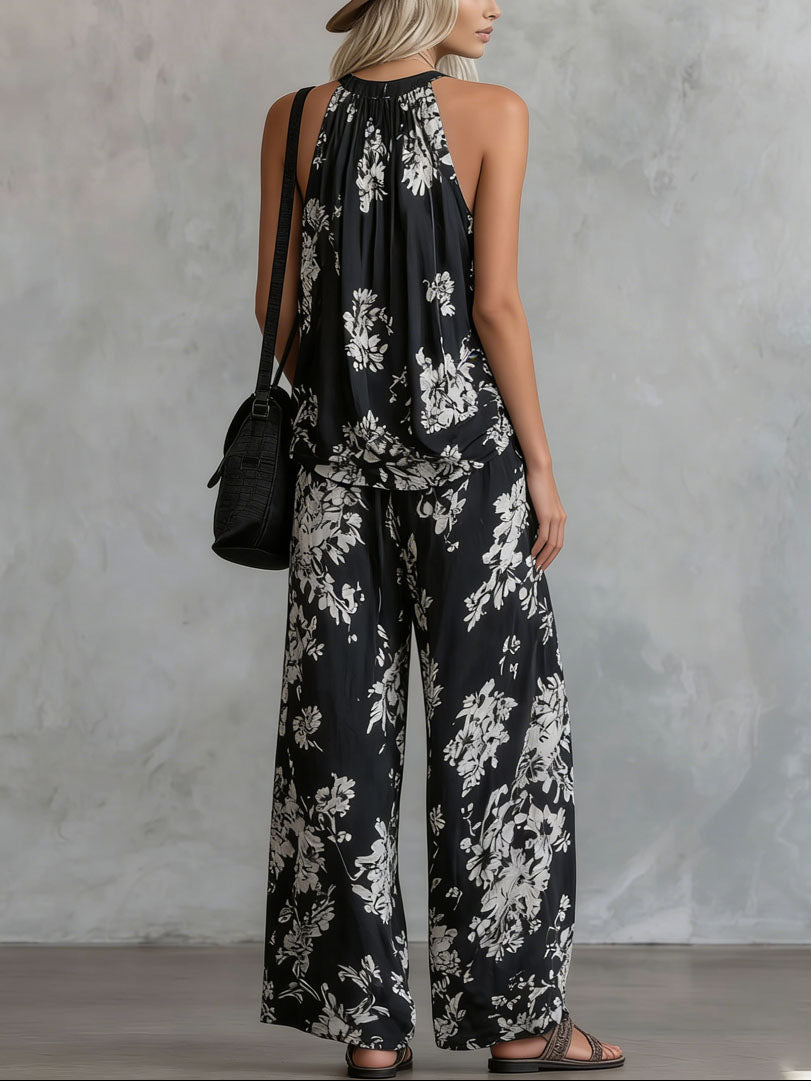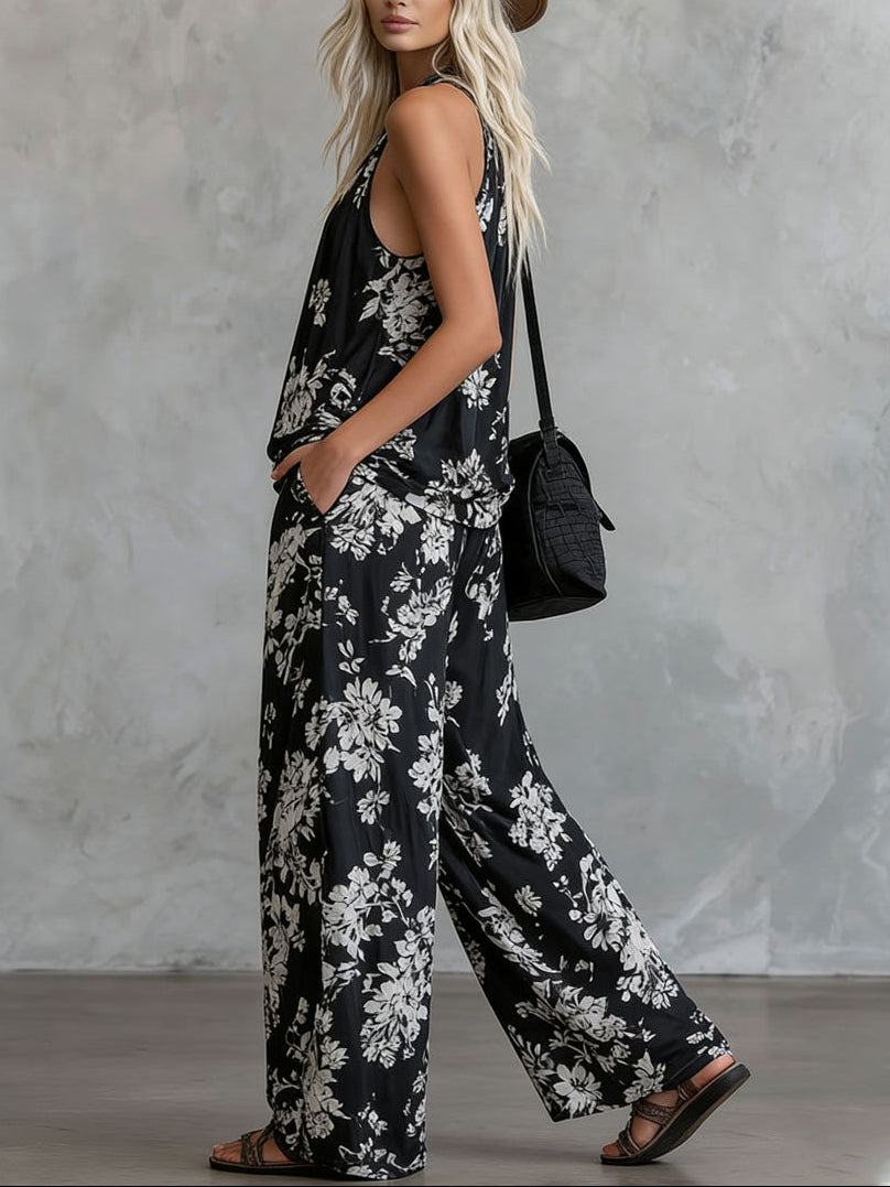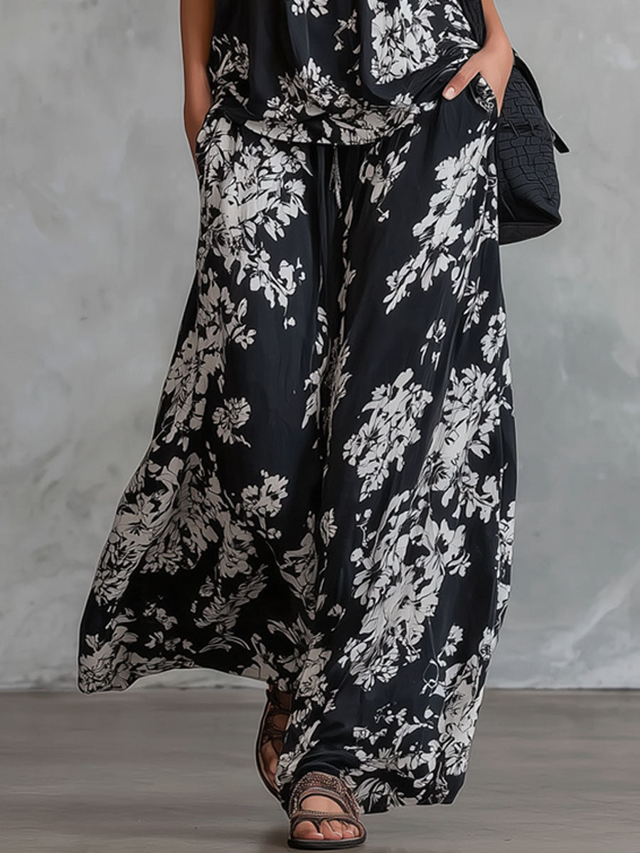 Floral Sleeveless Top and Wide-Leg Pants Loose Chiffon Set