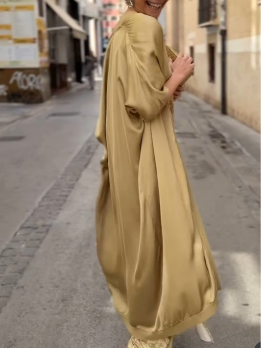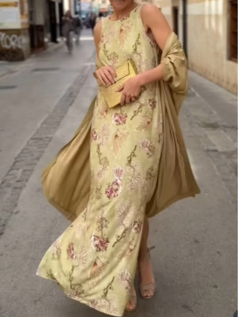 Gold Cardigan and Floral-Print Dress Two-Piece Set