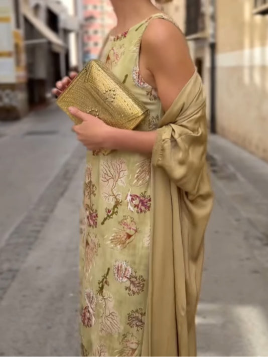 Elegant printed two-piece dress with cape