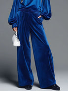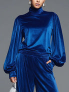 Blue Turtleneck Velvet Top And Wide-leg Trousers Two-piece Set