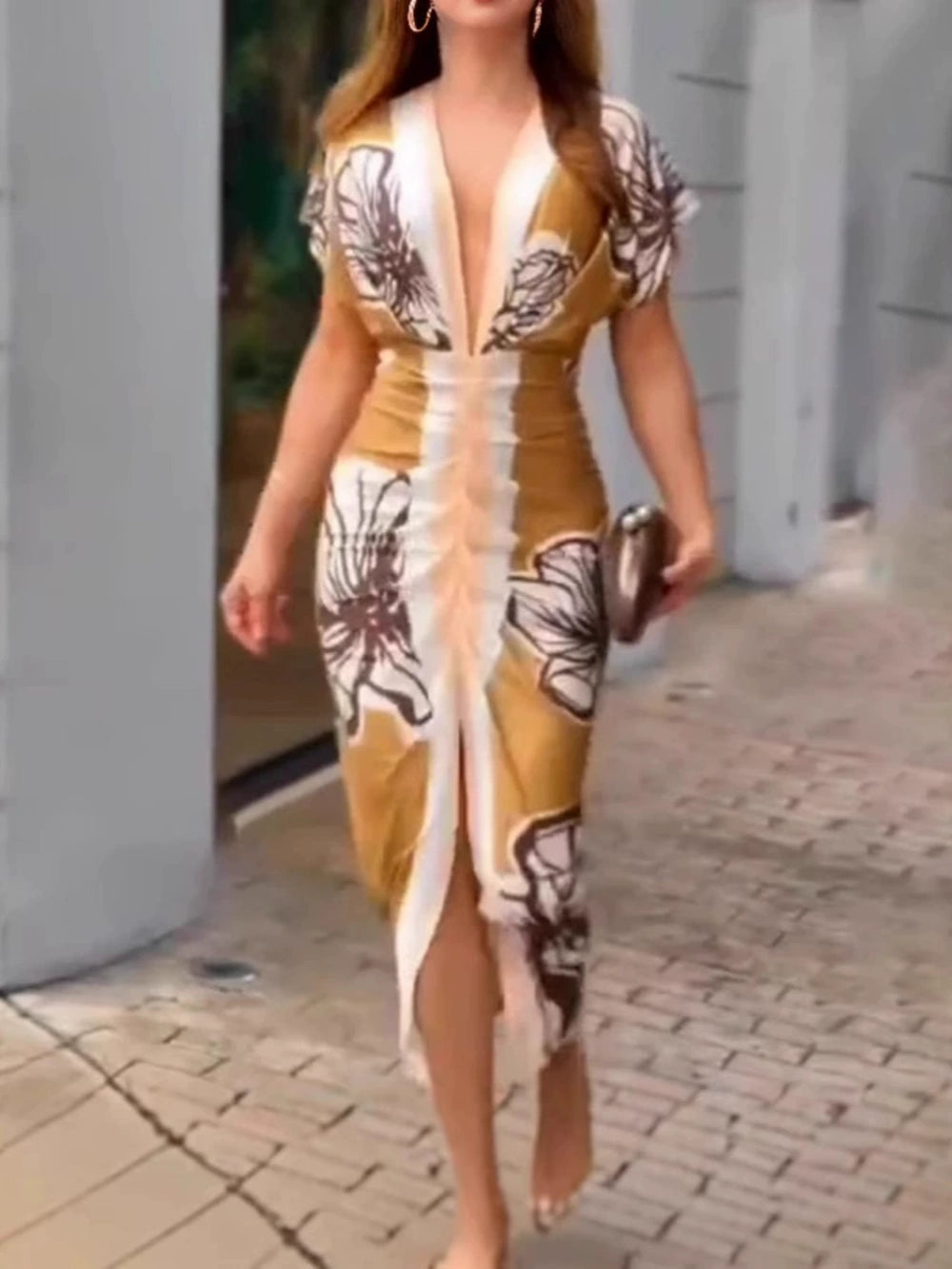 Elegance Floral Print Waterfall Sleeves Maxi Dress