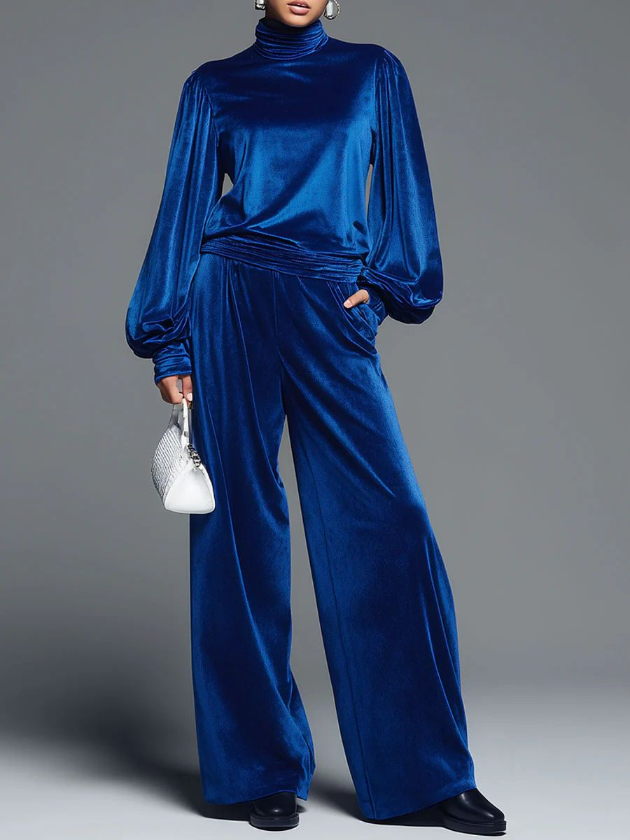 Blue Turtleneck Velvet Top And Wide-leg Trousers Two-piece Set