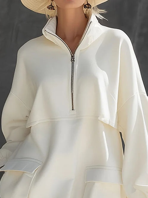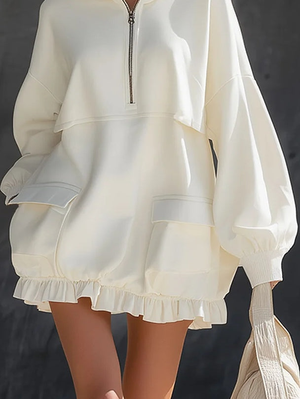 Stylish Sporty White Half-zip Ruffled Hem Mini Dress