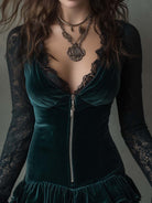 This velvet mini dress features a rich green hue, a fitted bodice, a front zip, and a double-layered ruffled skirt that flows gracefully with every step. A lace neckline and sheer lace sleeves add a touch of romance, while the luxurious velvet texture shimmers in the light, exuding understated charm.