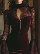 This burgundy velvet dress features a fitted silhouette, delicate lace sleeves, and a high neckline. A front zip adds a modern touch of sexiness, while flared lace cuffs and a sheer bodice lend it a vintage elegance.