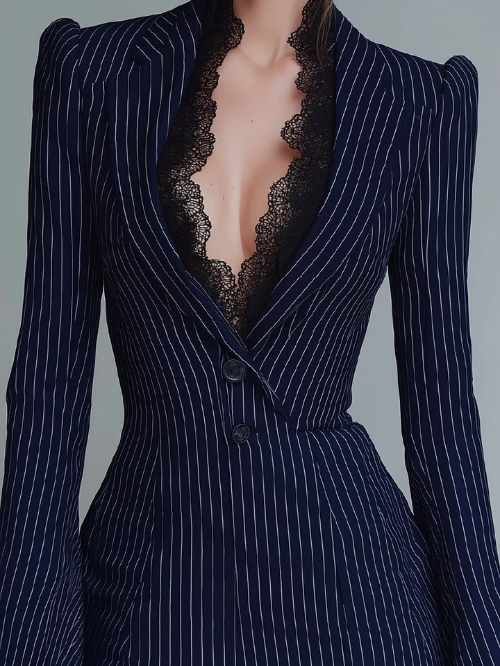 Navy Blue Striped Black Lace-trimmed Suit Mini Dress
