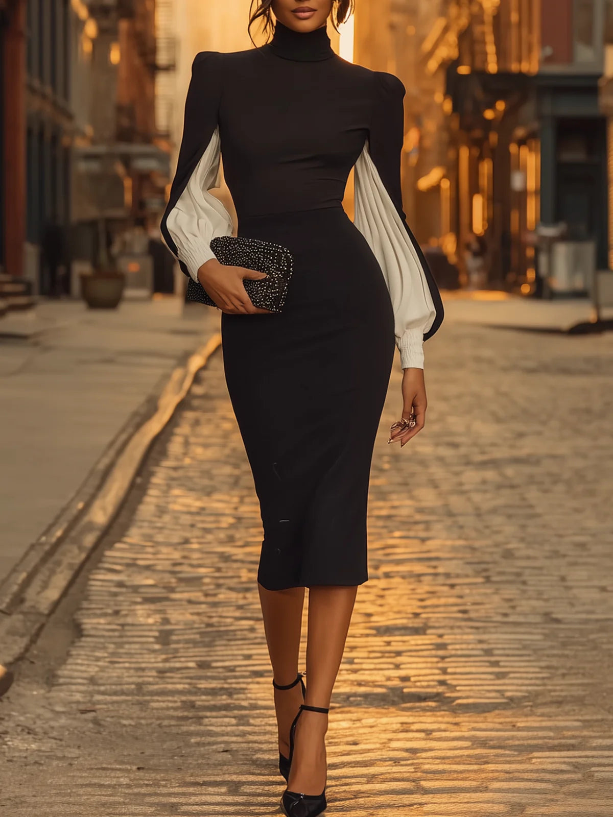 Elegant Black Midi Dress With Voluminous White Sleeves