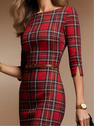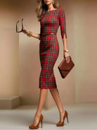 Red plaid three-quarter sleeve midi dress(Includes belt)