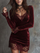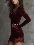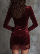 The V-neckline and lace-trim cuffs add a refined romantic touch, while the fitted waist and flared lace hemline shape a captivating feminine silhouette. It’s a piece designed to move gracefully between quiet luxury and celebration mood.