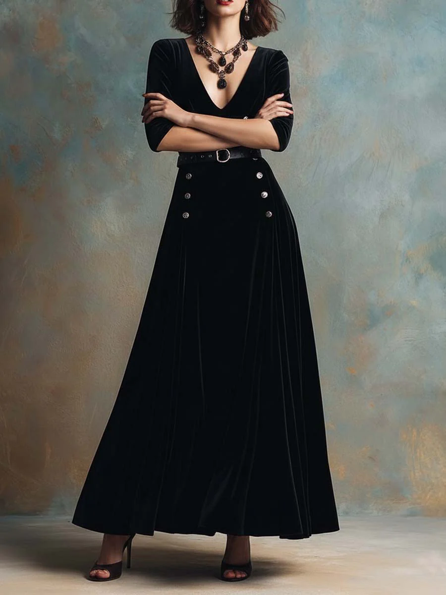 Black V-neck Velvet Double-breasted Maxi Dress (with belt)
