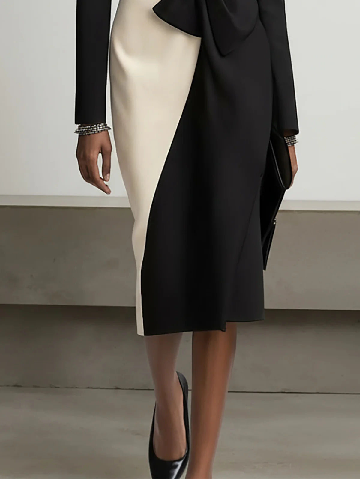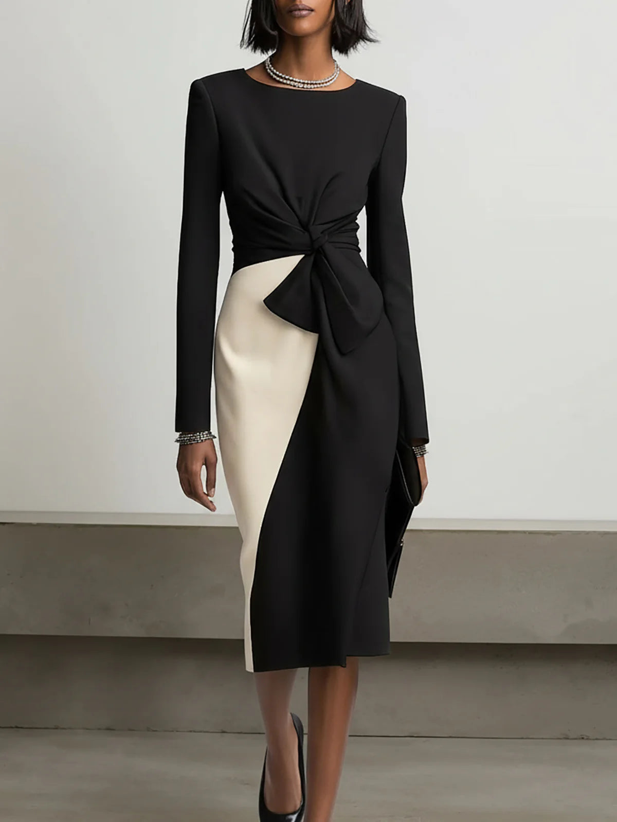 Elegant V-neck pleated long-sleeved dress with a fitted waist