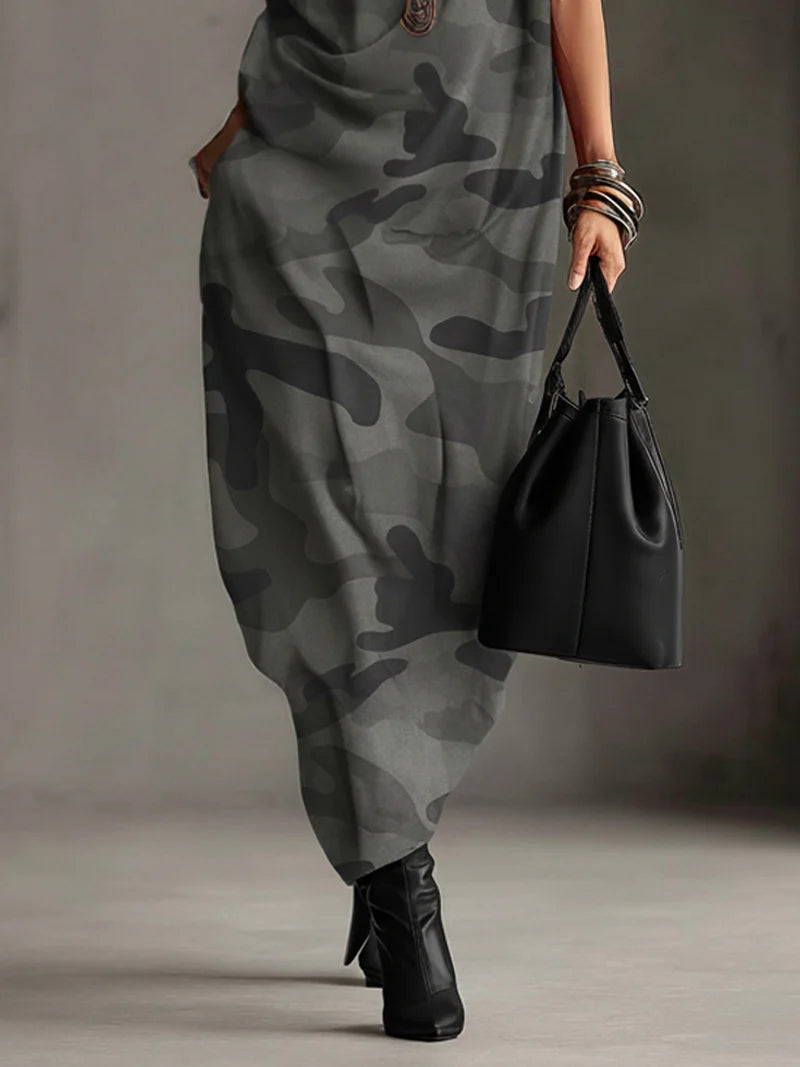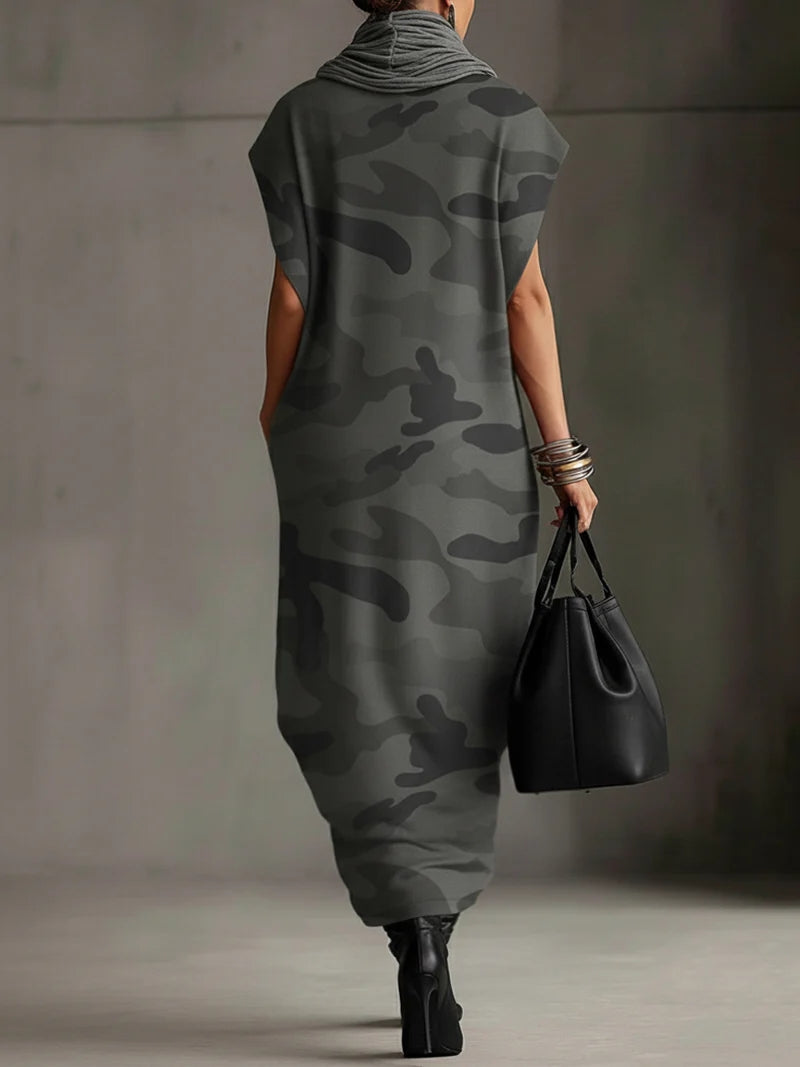 This camo-inspired maxi dress merges urban flair with minimalist elegance. Its high neckline and clean lines provide a modern touch, while the unique pattern and soft fabric deliver a casual yet sophisticated vibe. Pair it with chunky accessories and a sleek bag for a fully polished look that's perfect for city adventures or relaxed gatherings.