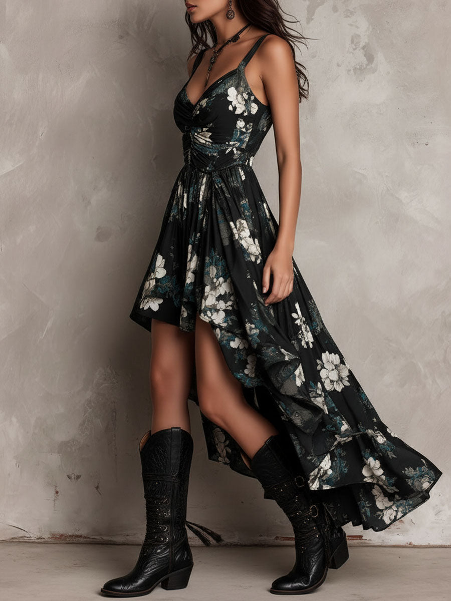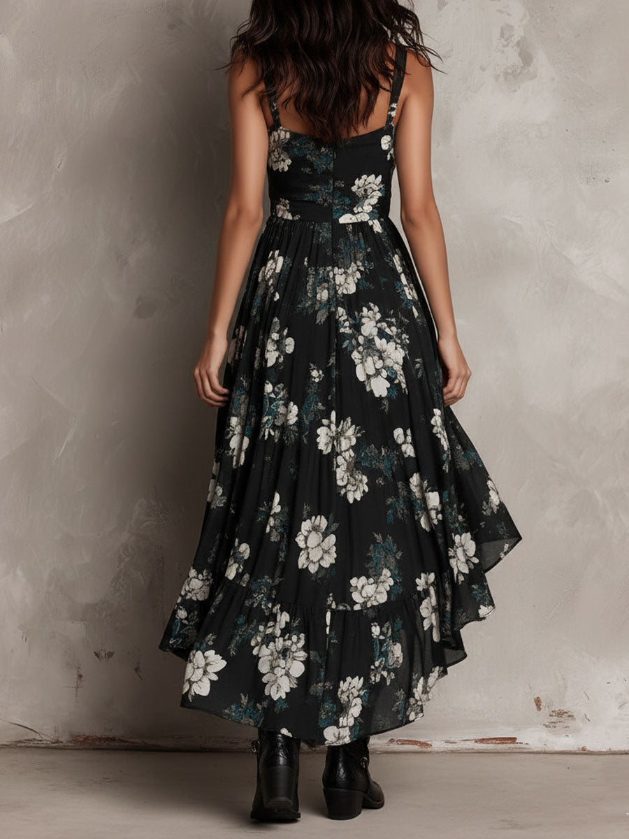 Black Bohemian Floral Print Irregular Strapless Maxi Dress