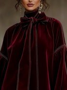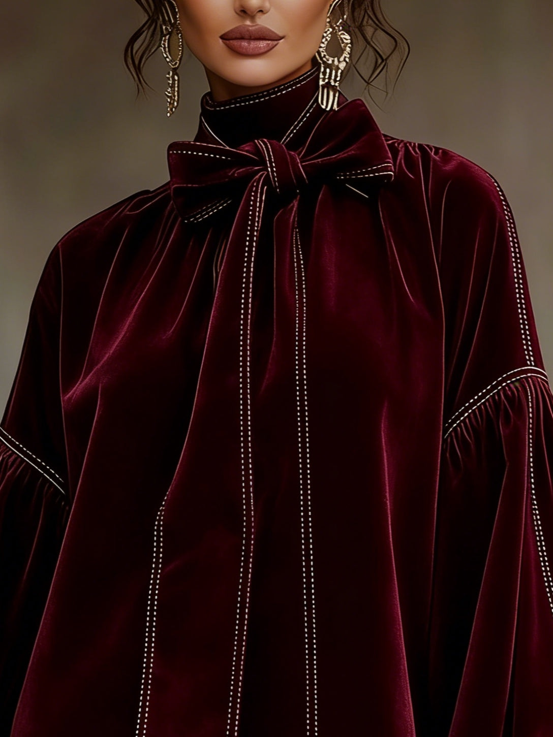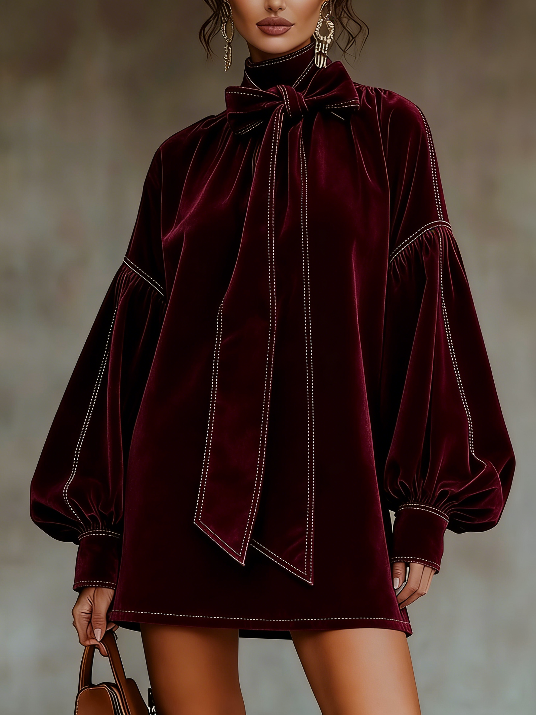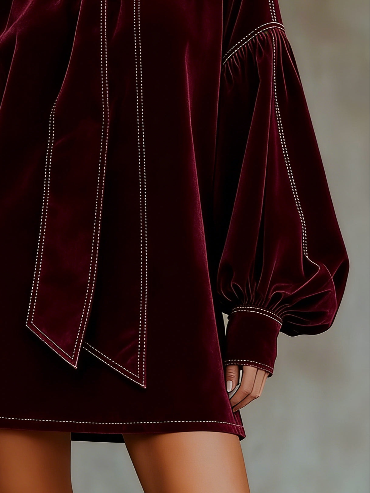 Burgundy Velvet Bow Lantern Sleeve Mini Dress