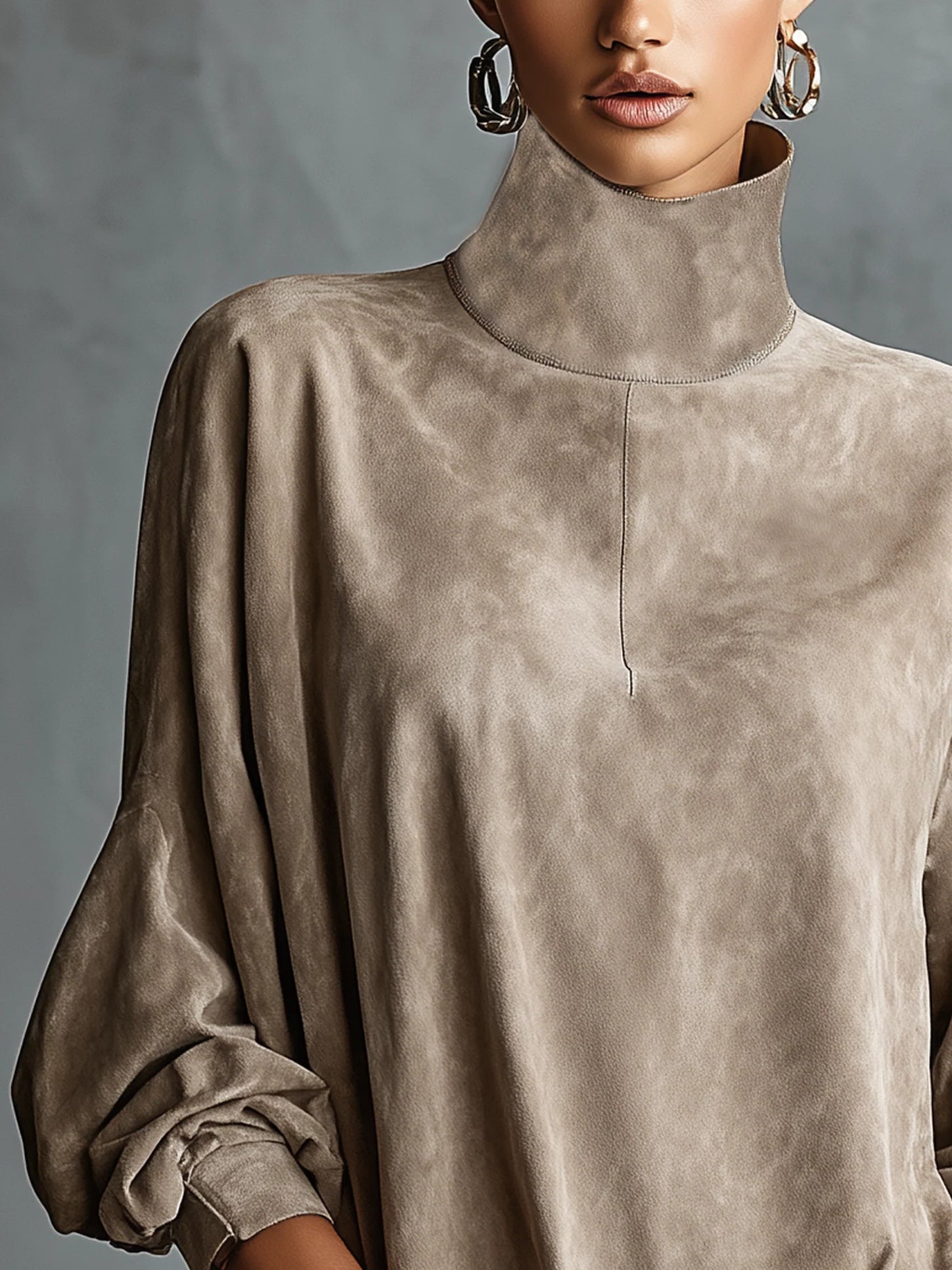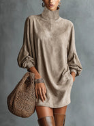Light Khaki Faux Suede Turtleneck Minimalist Loose Mini Dress