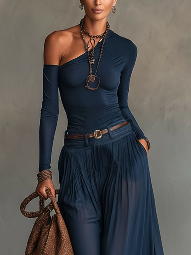 Navy Blue One-shoulder Top And Sheer Tulle Skirt Two-piece Set(with belt)