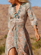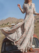 This full-length dress, available in all sizes, is flowy, comfortable, and exudes style. The V-neck design is lightweight and breathable, making it ideal for music festivals or everyday wear.
