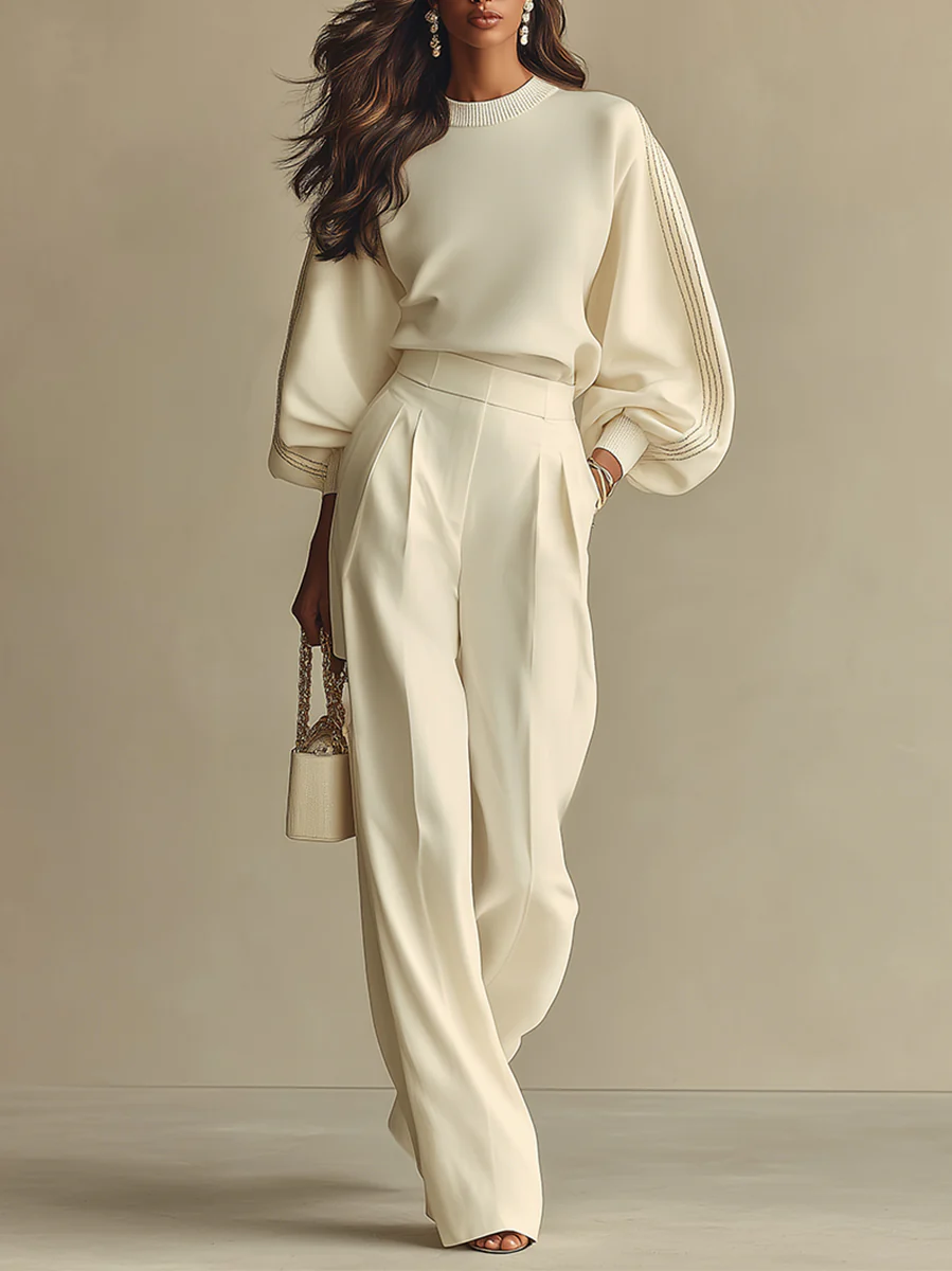 Color-blocked partial print crew neck top and trousers set