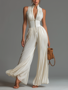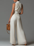 White V-neck Sleeveless Zip-up Pleated Wide-leg Chiffon Jumpsuit