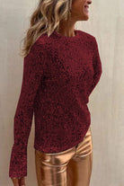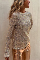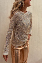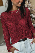 Sequined Mesh Long-Sleeved Slim-Fit Round Neck Top