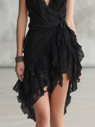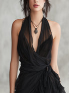 2.  Design: Features a deep V-neck halter neckline paired with an elegant, draped wrap-style silhouette. The hemline is finished with lace trim, creating a striking high-low aesthetic. Asymmetrical ruffles add a sense of dynamic movement and dramatic flair, perfectly blending modern sex appeal with vintage elegance.