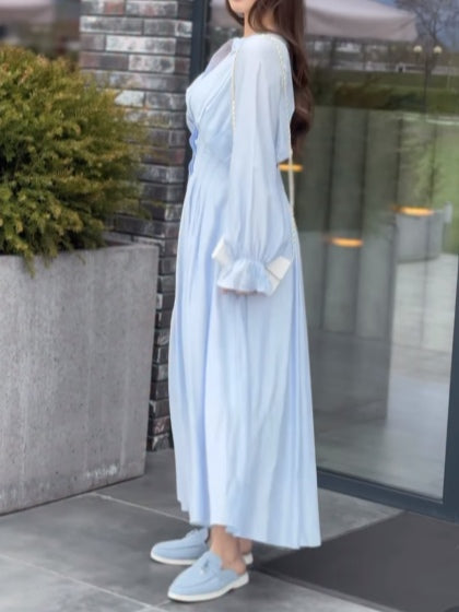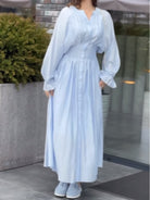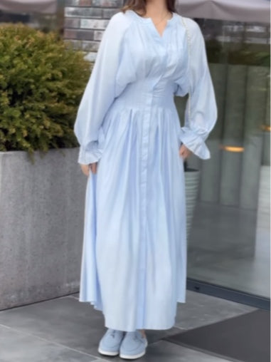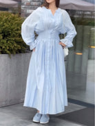 Blue Pleated Waist-Cinching Shirt Dress