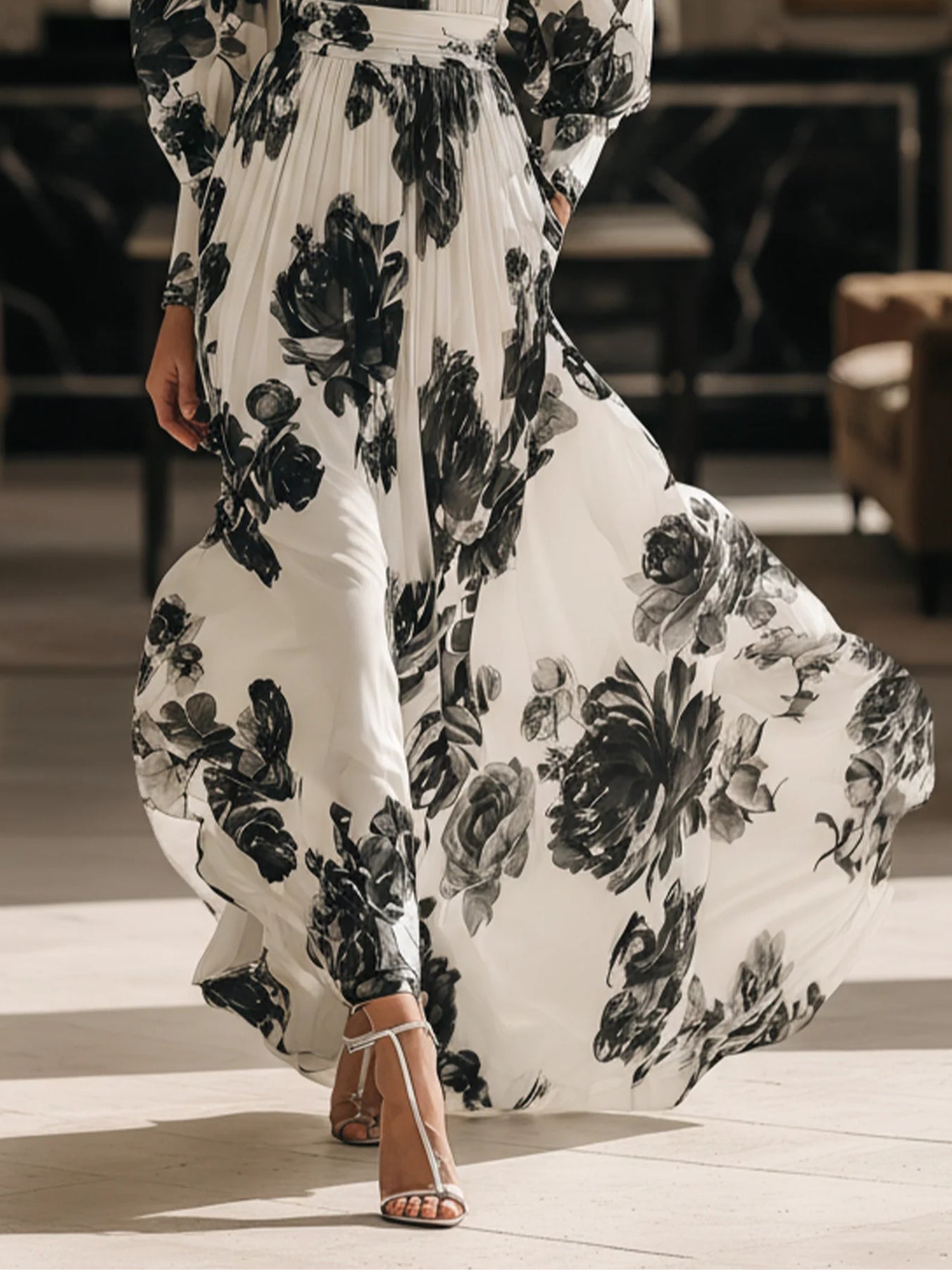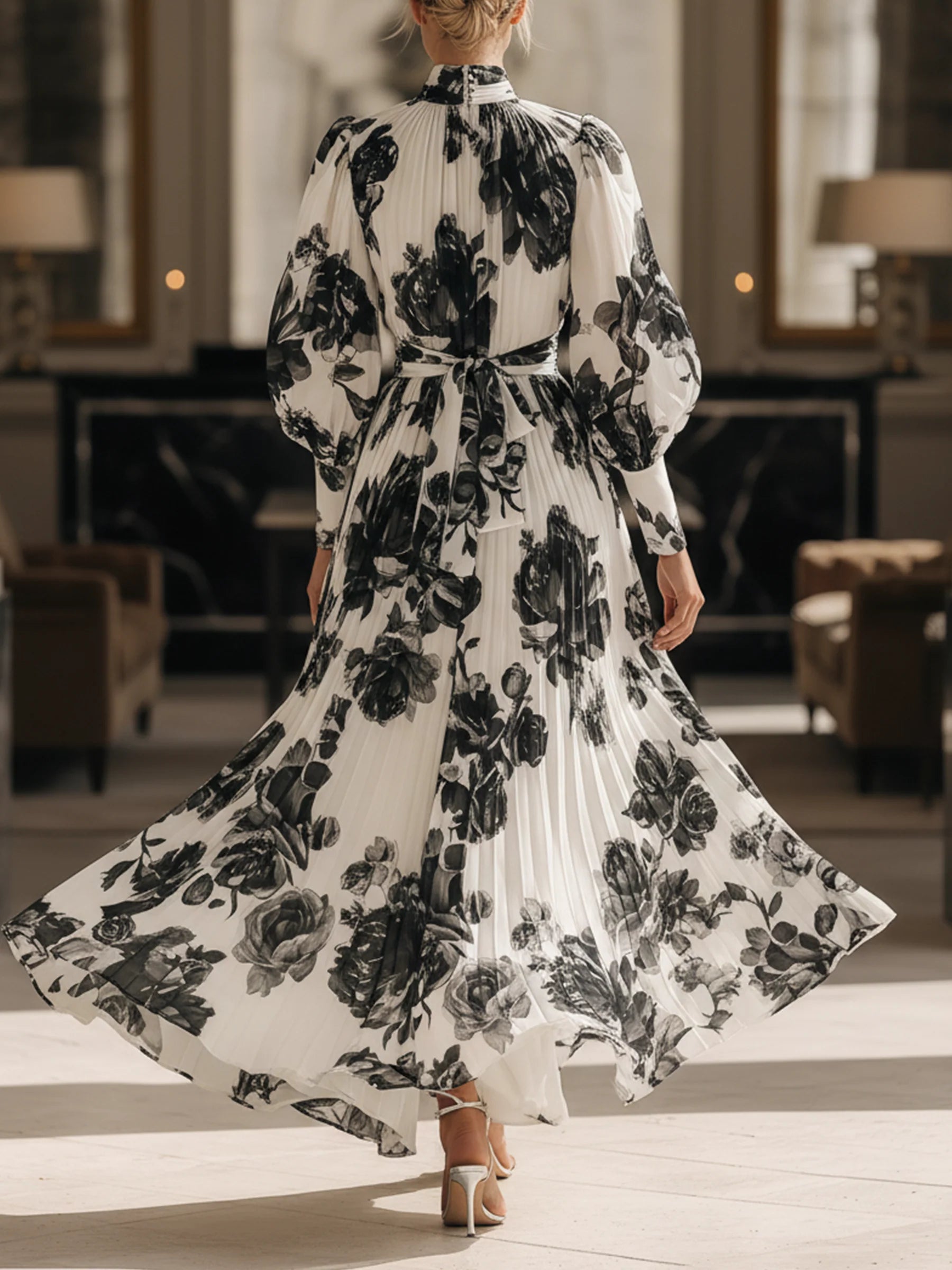 Black and white floral print high-neck chiffon maxi dress